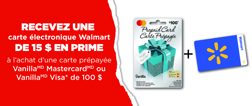 Offre valide dans les magasins Walmart Canada participants le 19 au 22 février 2026. Pour être admissible à cette promotion, le client doit acheter une carte prépayée VanillaMD Prepaid d’une valeur de 100 $. Avec chaque carte prépayée Vanilla Prepaid de 100 $ achetée, le client peut recevoir une (1) carte-cadeau électronique Walmart de 15 $ en prime. Pour réclamer la ou les carte(s)-cadeau(x) électronique(s) en prime allez à obtenirmaprime.ca au plus tard le 23 février 2026. Disponible jusqu'à épuisement des stocks de cartes-cadeaux électroniques seulement. Voir le site Web et/ou les cartes-cadeaux pour plus de détails et les conditions. Toutes les marques déposées sont la propriété de leurs propriétaires respectifs. La carte prépayée Vanilla Visa* est émise par la Compagnie de Fiducie Peoples, en vertu d’une licence de Visa Int. *Marque de commerce de Visa International Service Association et utilisée sous licence par la Compagnie de Fiducie Peoples. La carte prépayée Vanilla MastercardMD est émise par la Compagnie de Fiducie Peoples sous licence de Mastercard International Incorporated. Mastercard est une marque déposée et le concept de cercles est une marque de commerce de Mastercard International Incorporated.