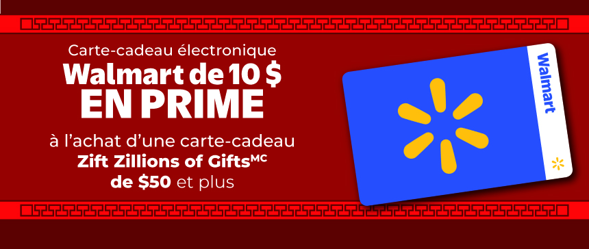 Offre valide dans les établissements Walmart participants du 12 au 25 février 2026, ou jusqu'à épuisement des stocks. Pour être admissible à cette promotion, les clients doivent doit acheter une carte-cadeau Zift Zillions of GiftsMC de 50 $ et plus. Avec chaque achat de 50 $ et plus, le client peut recevoir une (1) carte-cadeau électronique Walmart de 10 $. Pour réclamer la ou les carte(s)-cadeau(x) électronique(s) en prime allez à obtenirmaprime.ca au plus tard le 27 février 2026. Disponible jusqu'à épuisement des stocks de cartes-cadeaux électroniques seulement. Voir le site Web et/ou les cartes-cadeaux pour plus de détails et les conditions. Toutes les marques déposées sont la propriété de leurs propriétaires respectifs. La sélection de cartes-cadeaux Zift Zillions of GiftsMC varie selon le magasin. Offre valable au moment de l'achat. Les cartes Zift Zillions of GiftsMC sont émises par la Compagnie de Fiducie Peoples. La carte est échangeable uniquement sur le site ZillionsGift.ca contre des cartes-cadeaux électroniques des marques participantes, au Canada. Les options et les montants de la marque peuvent varier et être modifiés. Les marques de commerce des marchands sont la propriété intellectuelle des marchands respectifs et sont utilisées avec autorisation. Pas d'accès aux espèces ni aux distributeurs automatiques. Des conditions générales s'appliquent. Voir le contrat électronique du titulaire de la carte pour plus de détails. Les émetteurs n'approuvent pas, ne sponsorisent pas et ne sont en aucun cas affiliés à cette offre.