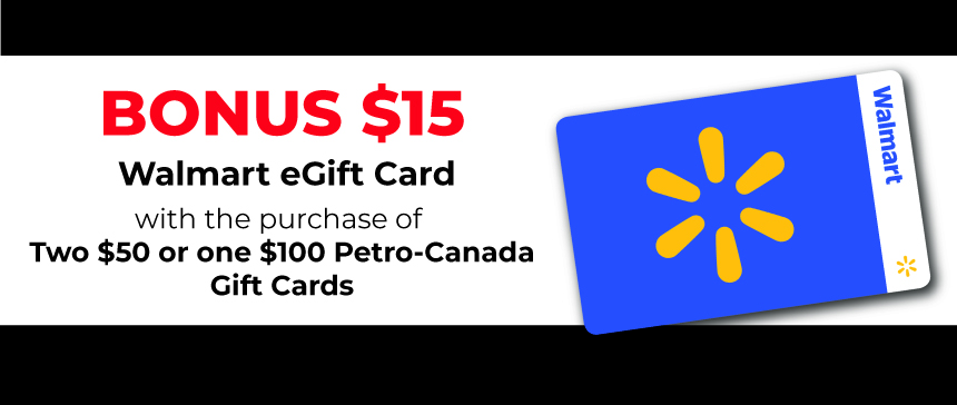*Availability on Walmart.ca may differ from in-store. Offer valid at participating Walmart Canada locations and on Walmart.ca from October 30 - November 5 , 2025, or while supplies last. To qualify for this promotion, customer must purchase two (2) $50 Petro-Canada gift cards. Receive one (1) $15 Bonus Walmart eGift card. To claim your Bonus $15 eGift Card(s), go to getmybonus.ca. Claim must be made by November 6, 2025. Bonus eGift cards are available while supplies last. Further details, terms, and conditions may be available on the website and/or on the specific gift card(s) purchased. All trademarks are property of their respective owners. Petro-Canada is a Suncor business. TM Trademark of Suncor Energy Inc. Used under licence.